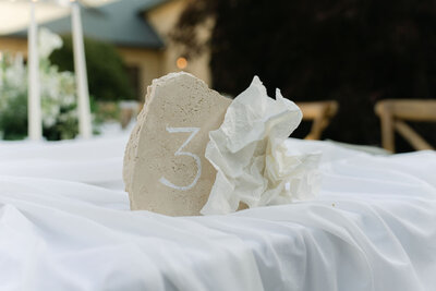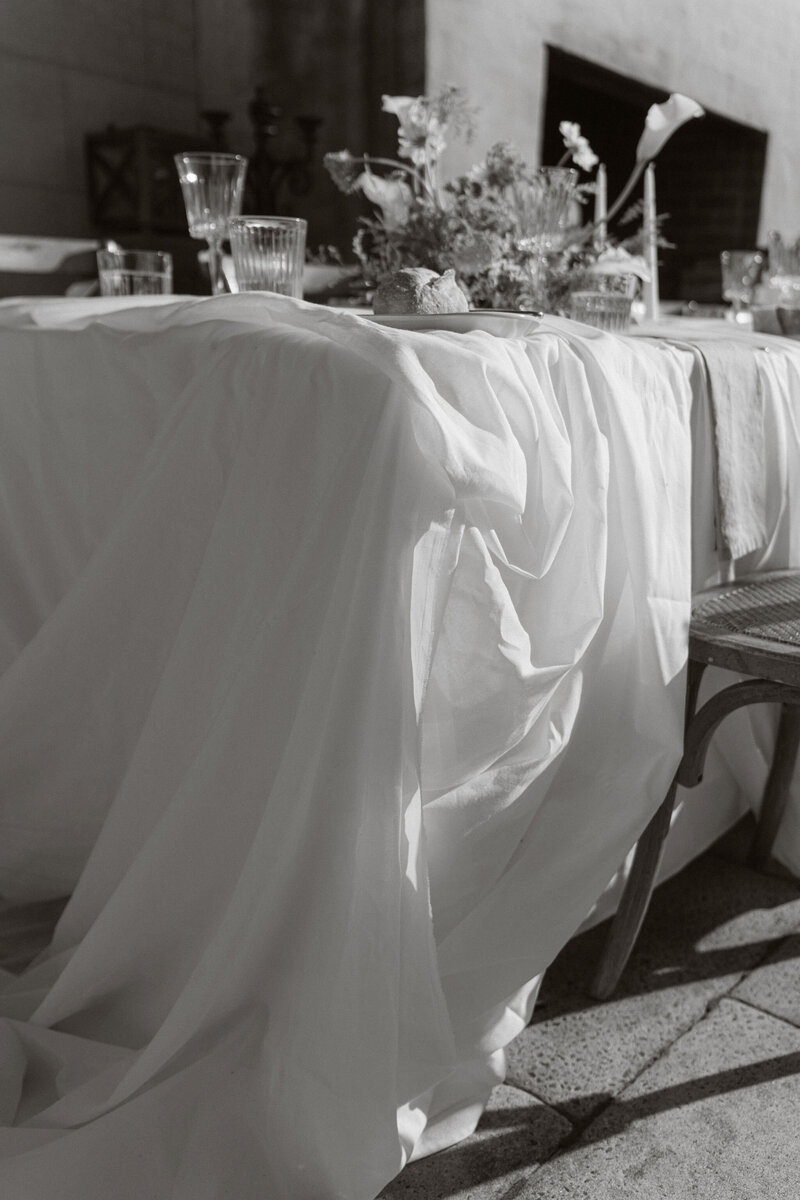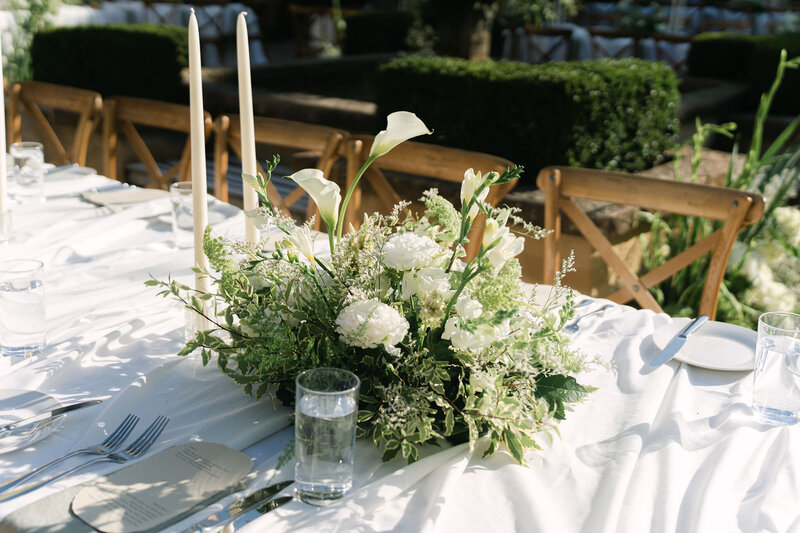 The floral arrangements were voluminous, sculptural, and textural. Glass candle holders, travertine and parchment in the table numbers, and soft flowing table draping are just some of the non-organic elements we employed. And here's a fun fact: we used more than 400 meters of fabric throughout this reception space just for table draping. That's almost half a kilometre long!