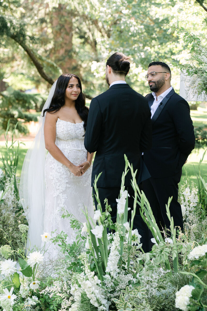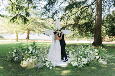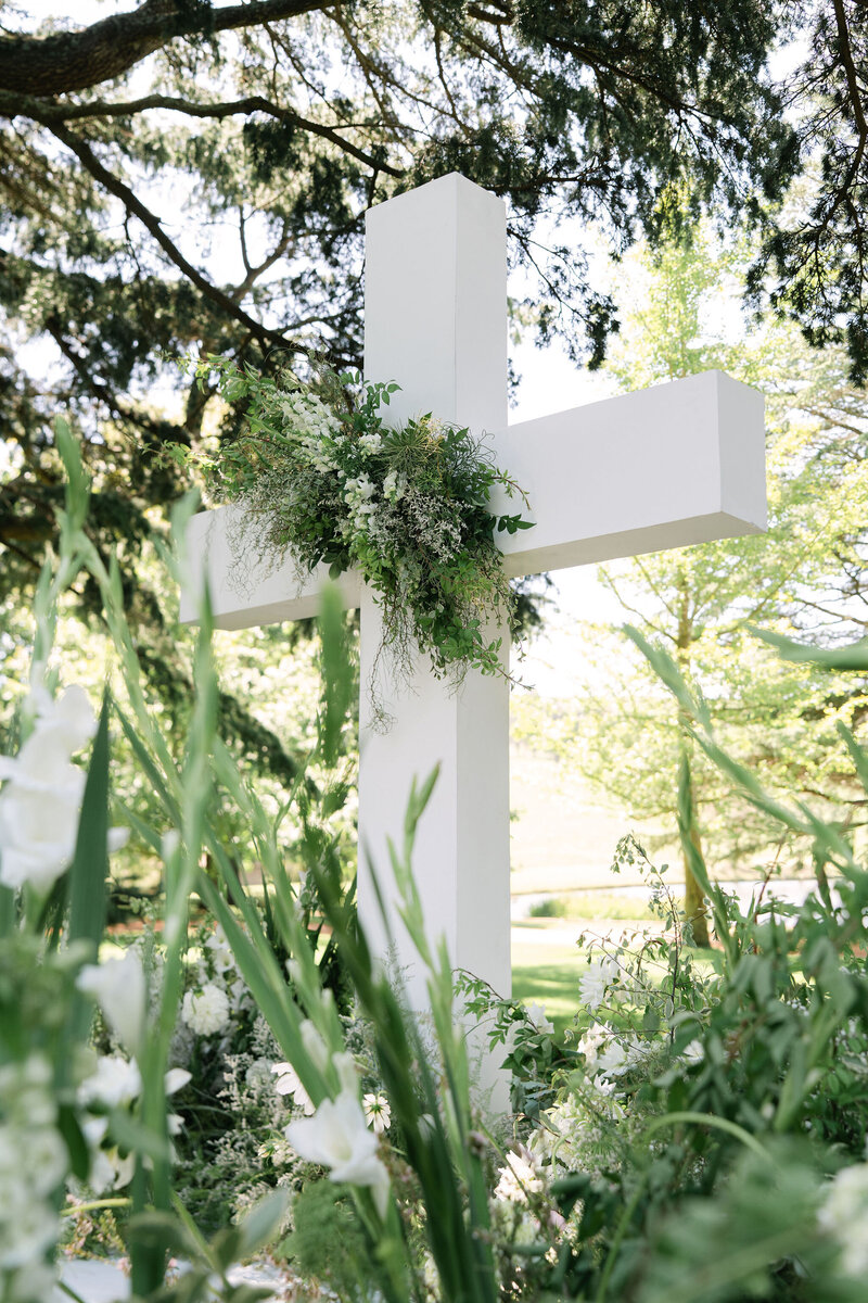 We decided to take it a step further, and made it our brief to manifest the reverence of a place of worship in the grounds where they'll say their vows. The crucifix takes centre stage -and built to scale, Alex is a tall man! We employed a stage to be intentional with declaring the space for the ceremony, and then blend it back to the environment with tall, sculptural florals that feel like they grew from the ground. We made a site-visit several months prior to note the natural colour tones in the space, in order to make sure our floral choice and final design complements them nicely.
