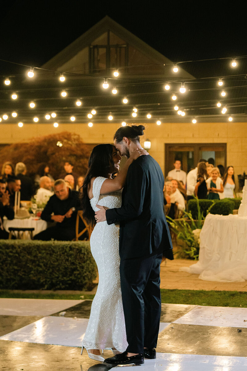 Strings of festoon lights across the courtyard add to the Italian 'festa' feel; much more appropriately than fairy lights would. We opted for a chequered dance floor for a more elevated European look. As the sun sets on our newlyweds' celebration, the atmosphere was warm and full of love. Food and drink were flowing, the laughter unceasing, and the dancing: out of this world!
