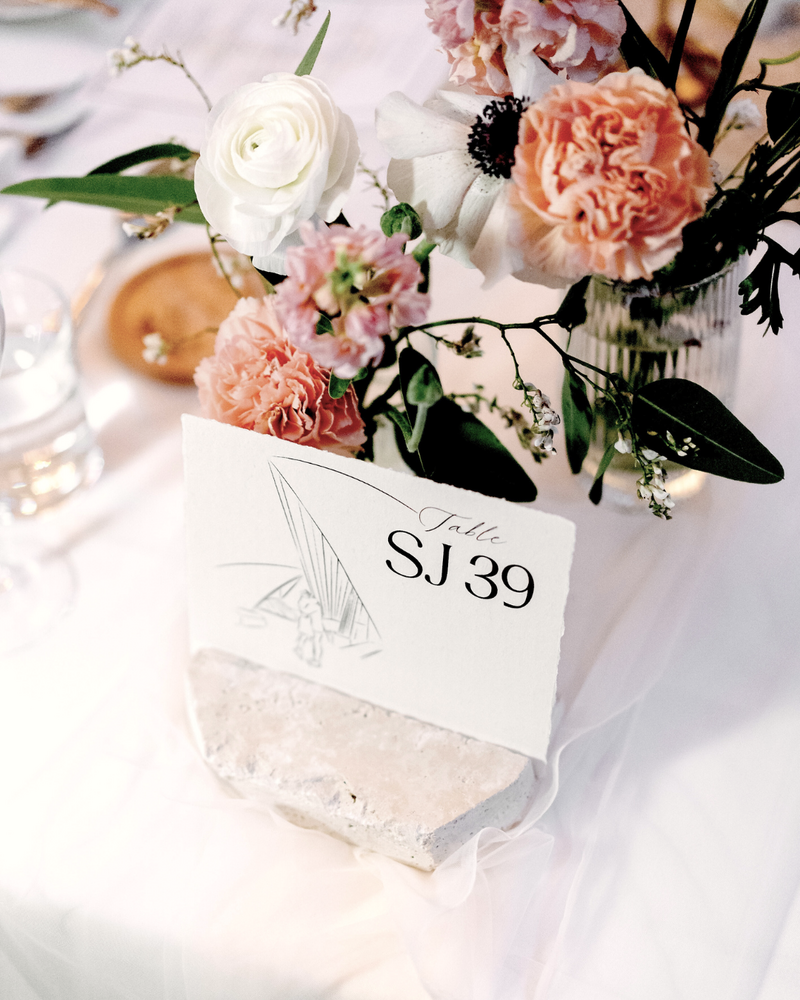 On the table number signage, we drew an illustration of what happened in that period of their lives: from the first meeting, planning their future together, the proposal, and as seen here: Flight SJ39, the fourth and final flight, was the one Pauleen took to come to Australia to join the love of her life.