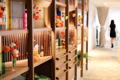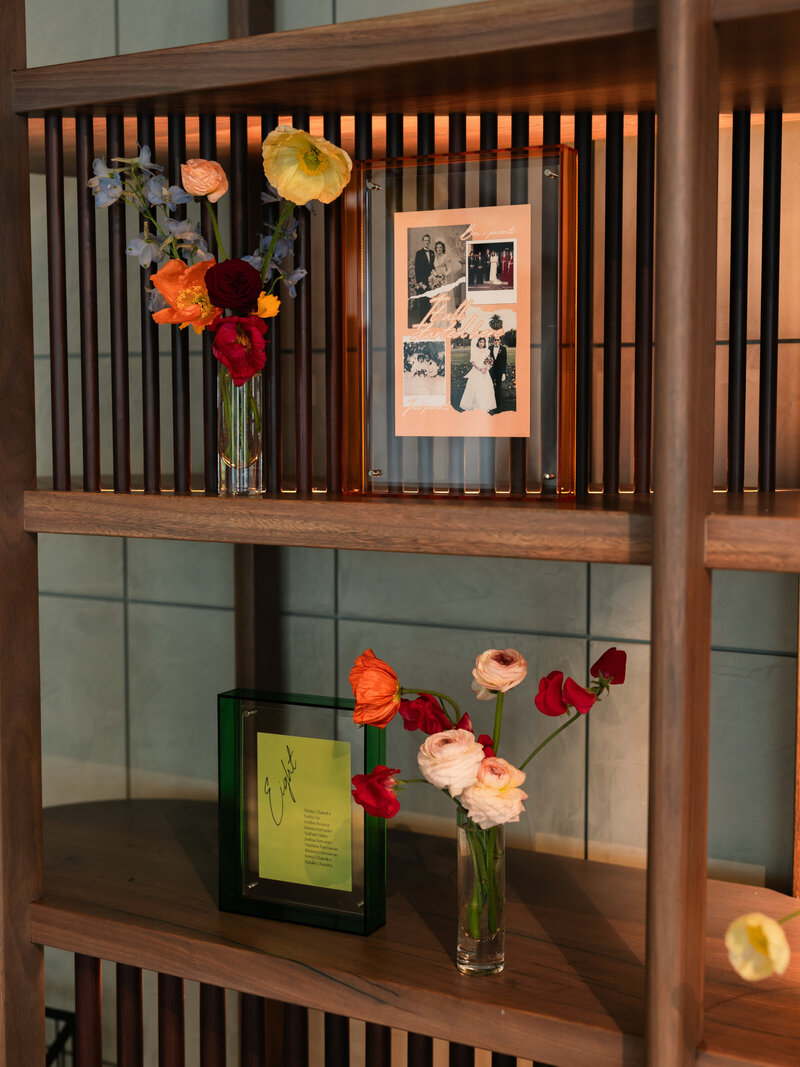 We activated the shelving unit in the venue's foyer to be a seating chart. And while guests are at it, they'd also see photos of the couple going back from where they are now to their childhood, and even some wedding photos from their parents! A visual narrative of their love story so far. The styling ties it all together.